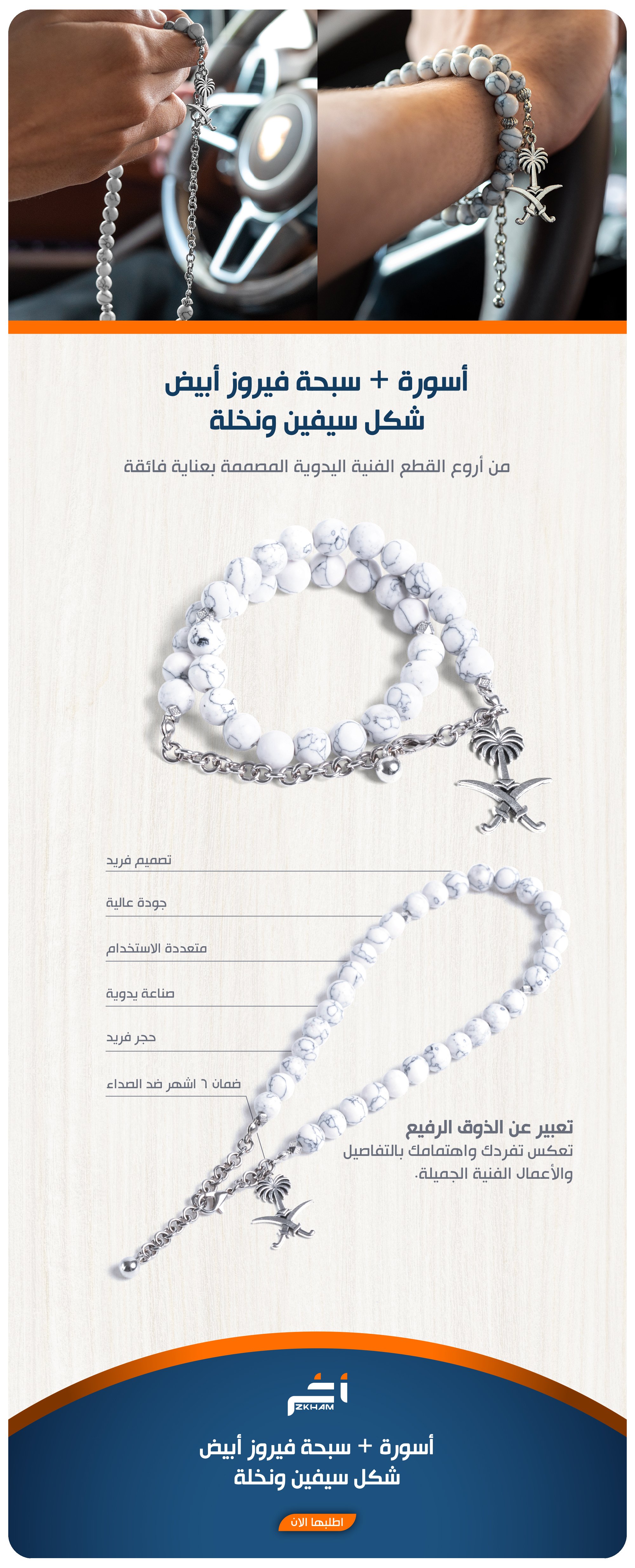 تعد سبحة (الفيروز الابيض) بشكل سيفين ونخلة و إسورة من أروع القطع الفنية اليدوية المصممة بعناية فائقة، حيث تجمع بين روعة التصميم والأناقة الساحرة. يتم تصنيعها بعناية يدوياً باستخدام أجود الأحجار الكريمة والمواد الفاخرة، مما يضفي عليها مظهرًا ساحرًا وفريدًا. و يجعلها تحتفظ بجاذبيتها ولمعانها لفترة طويلة.