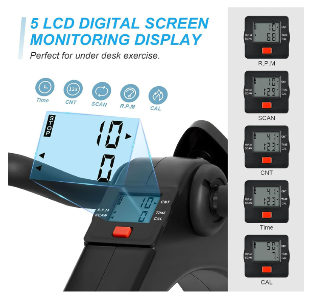 - شاشة LCD: شاشة عرض ذات 4 وظائف لعرض وقت التمارين وعدد الدورات واللفات في الدقيقة والسعرات الحرارية المحروقة، بالإضافة إلى وظيفة المسح الضوئي لعرض جميع القيم.