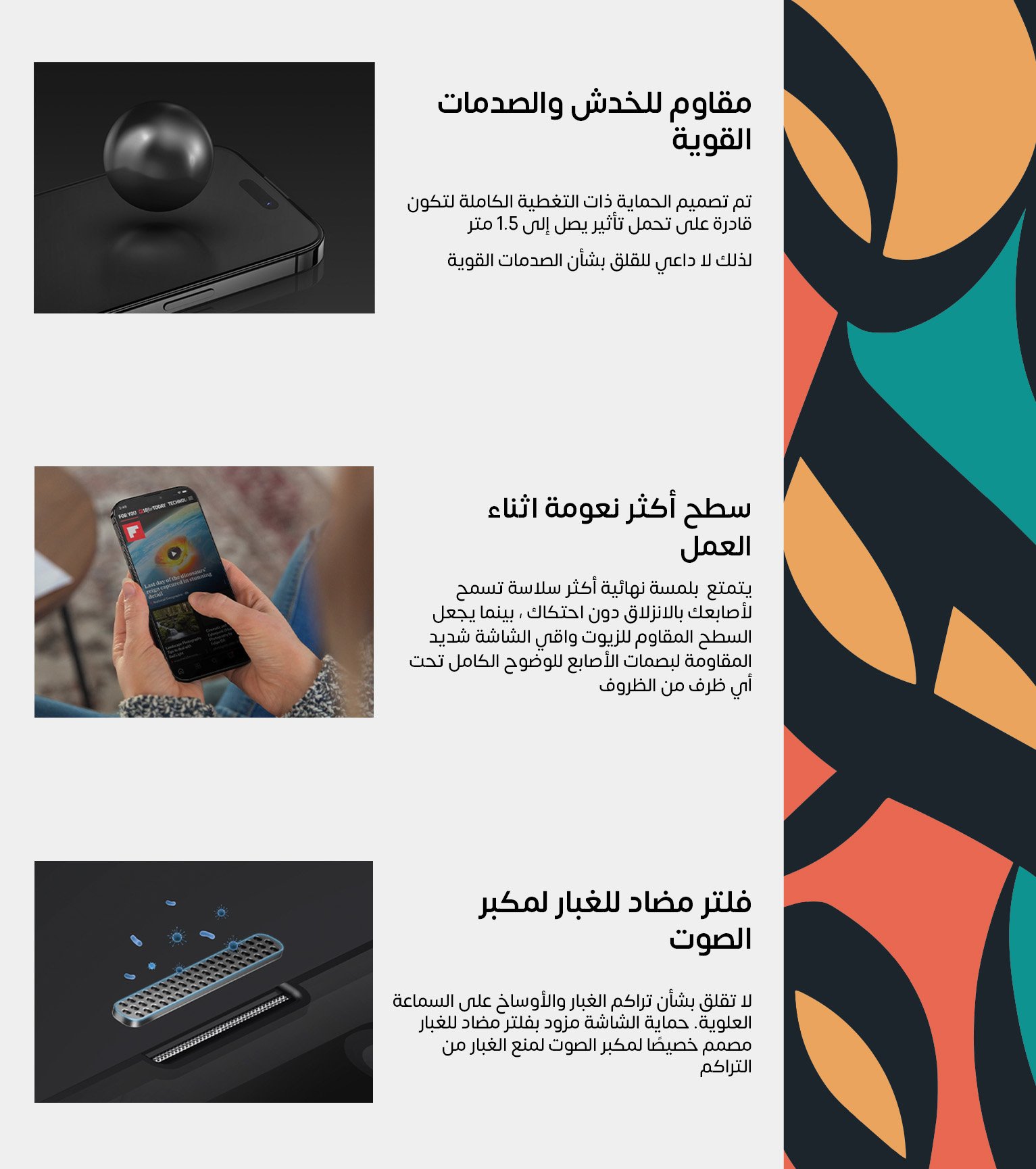 حماية شاشة مقاوم للخدوش والصدمات. تحتوي على طلاء مضاد للبكتيريا يقلل من آثار بصمات الأصابع ويقتل ما يصل إلى 99.99٪ .