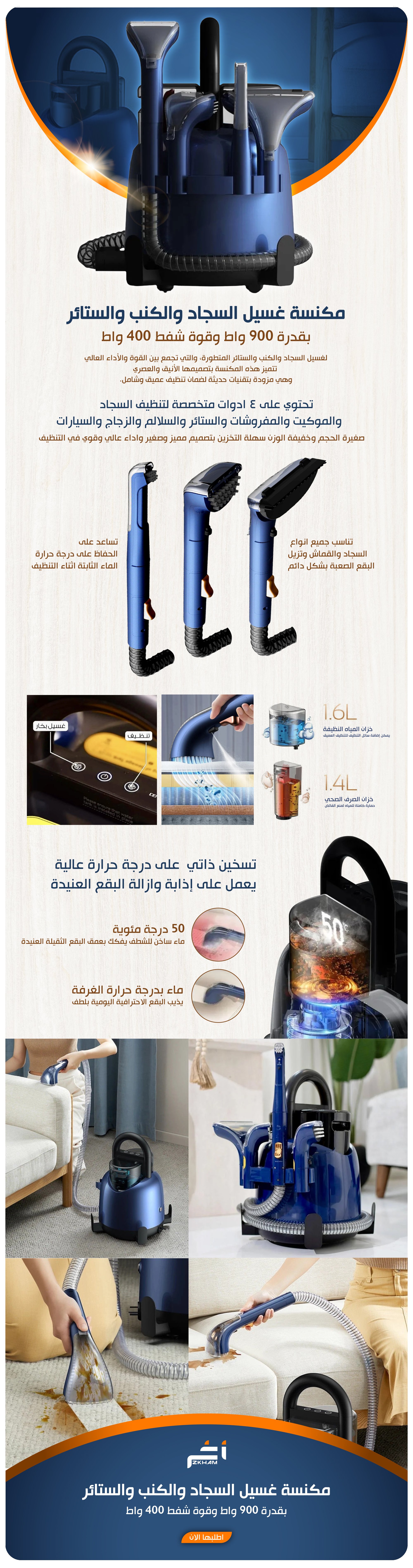 • قوة شفط عالية: تتميز بمحرك قوي يوفر شفط قوي يمكنه إزالة الأوساخ والبقع العنيدة من السجاد والكنب والستائر بفعالية.